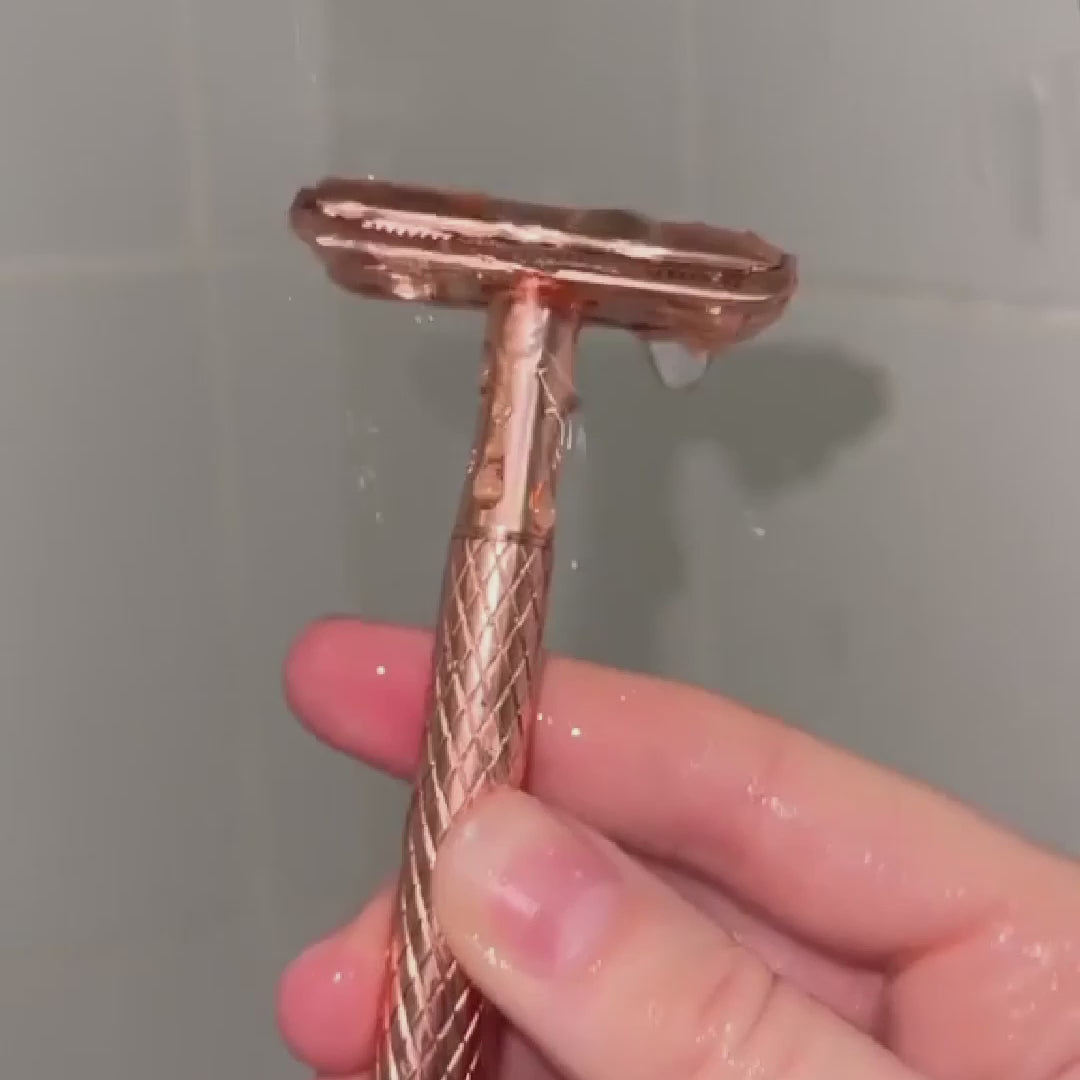 First off, this razor is BEAUTIFUL and it feels great in the hand. It is weighted, so there is some hefty to it. It comes with blades that you install by turning a screw. The top opens up & you drop a blade in. You then close the razor back up & you are ready to shave. A tiny sliver of the razor will be sticking out of the head. This razor does take some getting used to. You are supposed to go slow and not press down too hard. That was definitely a learning curve for me because I am used to quickly swiping a razor over my legs & being down with it. I had to really slow down with this one & actually ended up cutting myself. However, the shave is very very close. I normally shave every night, but I decided to run a test to see if I could get away with shaving every other night, and because this razor provides such a close shave, I can. This is the perfect choice for those who want to shave less, but who are willing to slow down the shaving process.